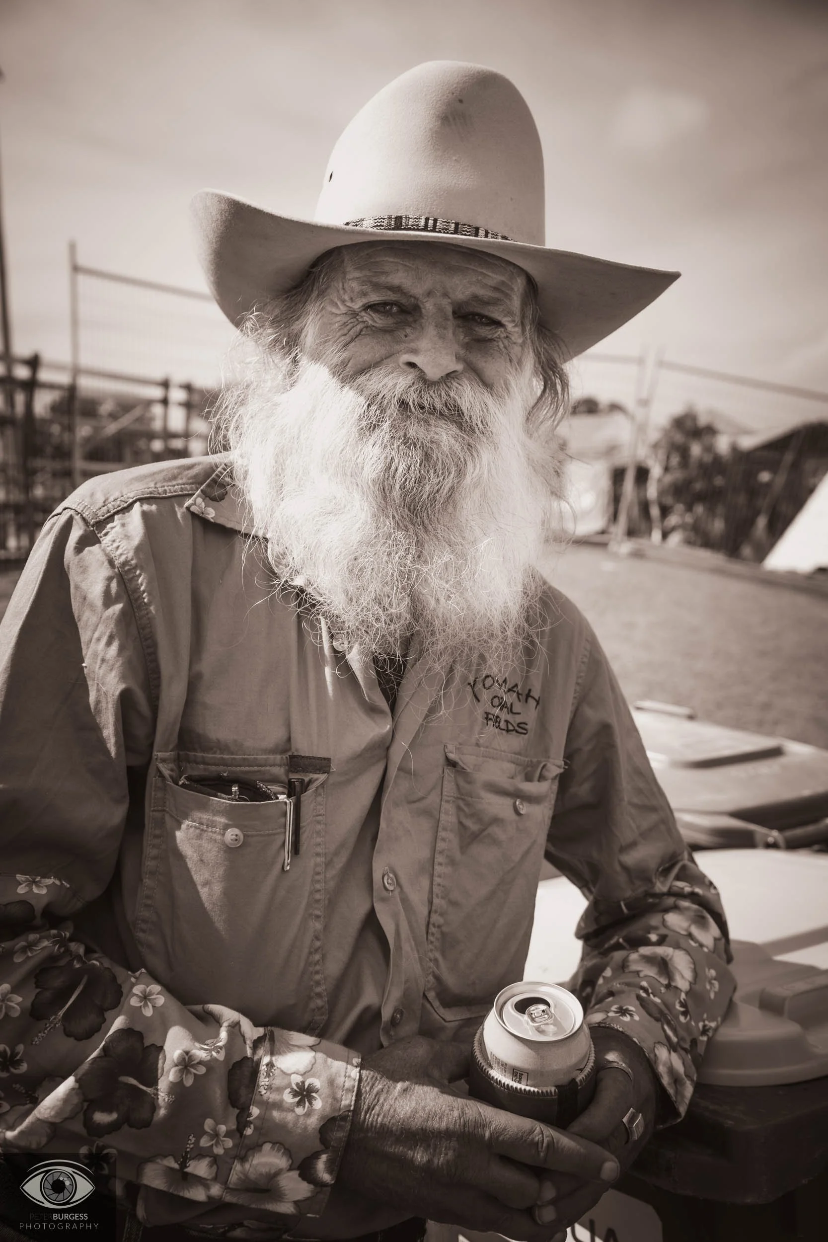 As I turned to continue to look for the burley men of the axe-swinging type, a thin, sun-weathered figure leaned with a bent elbow on a wheely-bin that doubled as a bar table. His orange high-vis shirt was impeccably clean and had been custom fitted with floral-designed sleeves. Although early in the morning, he clutched a stubby holder which I guessed contained a little something to calm the nerves. This was Bushie and he was waiting for his name to be called up to the stage to recite his poem for The John David Memorial – Open Bush Poetry Speaking Competition.